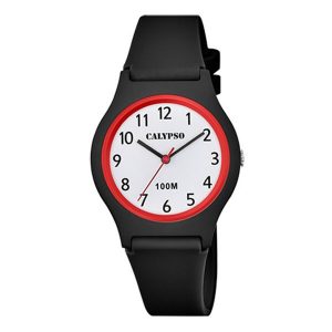 Relógio de criança, caixa em Policarbonato preto, mostrador branco e vermelho, bracelete borracha preto, fecho fivela