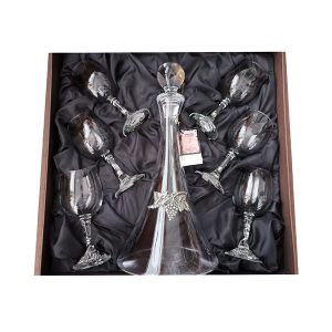 Conjunto de copos e garrafa em vidro com aplicação em estanho, com estojo