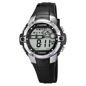 Relógio de criança, caixa em Policarbonato preto c/ botões cinza , mostrador digital ciza com aro cinza, bracelete borracha preto, fecho fivela