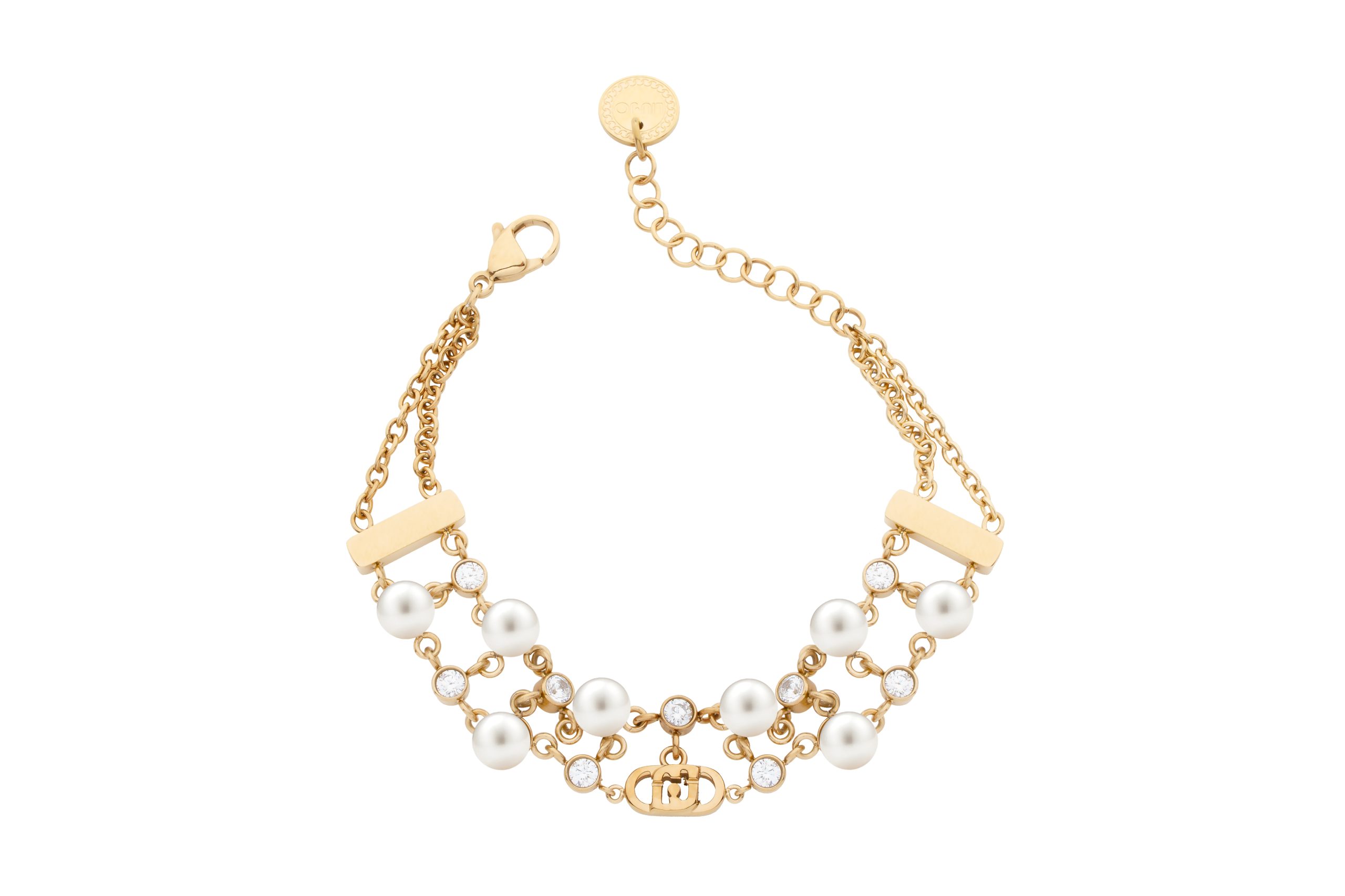 Pulseira em aço dourado com pérolas e logótipo.