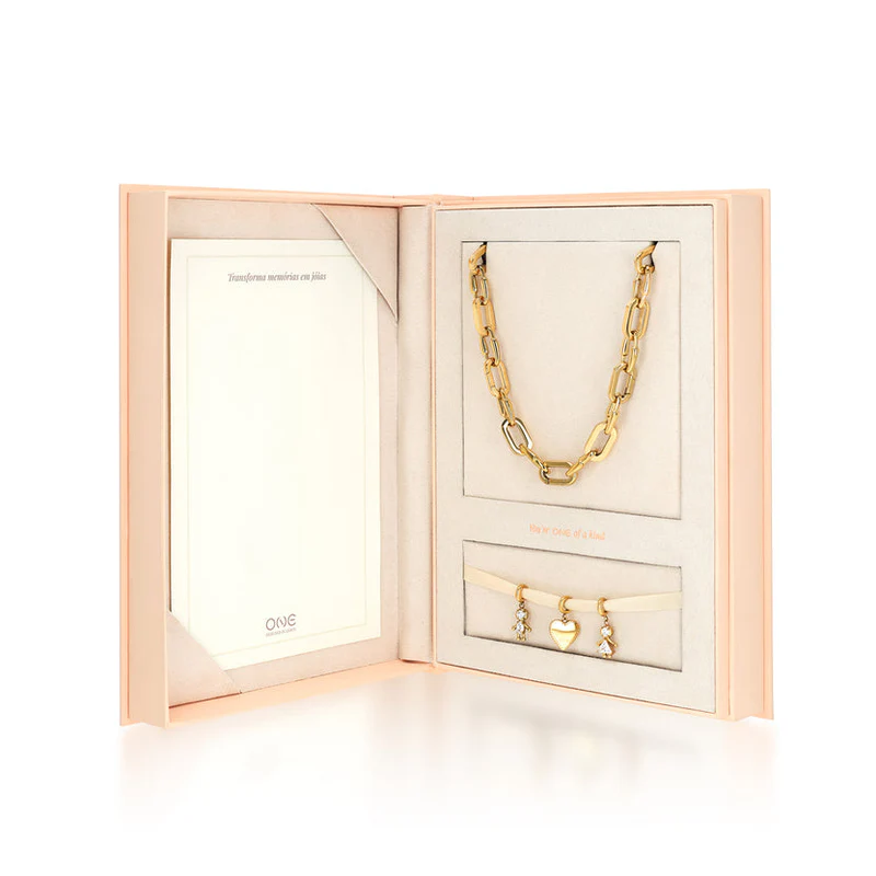 Colar em aço dourado com um berloque de coração e dois berloques à escolha.